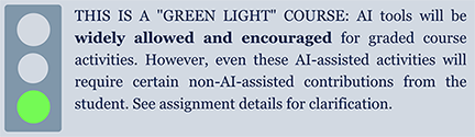 George Fox University has a university-wide AI policy for students and faculty, here. Students may not assume AI use is permitted for any graded element of the course unless that permission is explicitly granted. In this course, our policy is that AI is a tool that can be utilized if used appropriately.
